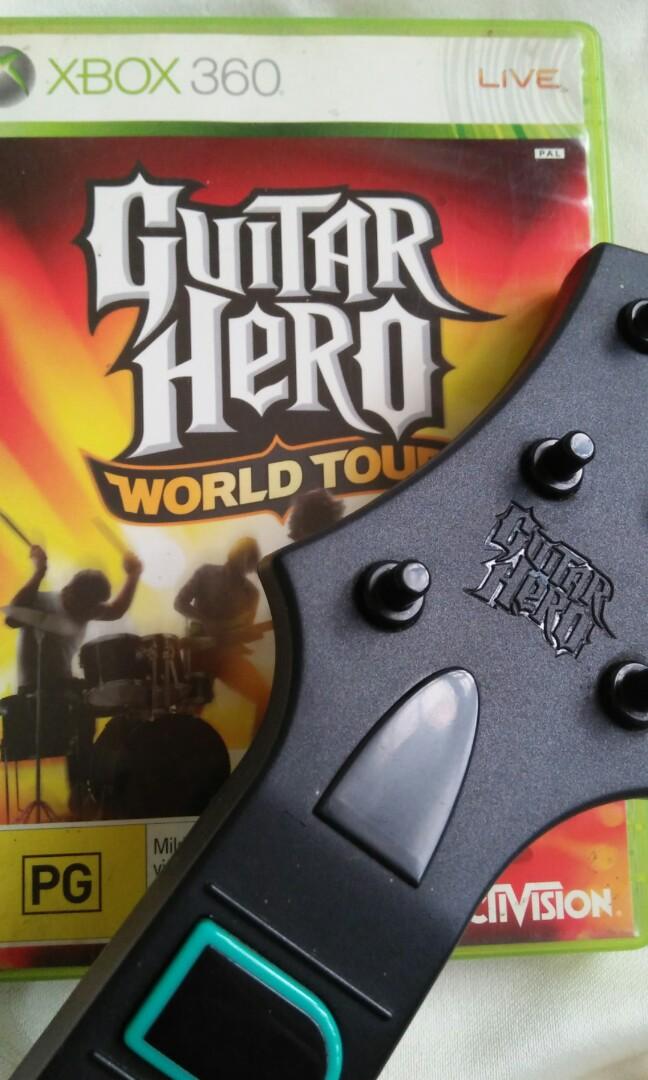 New Listing Xbox 360 Guitar Hero Sunburst Controller World Tour BUNDLE Strap Game Microphone Turn on the Xbox 360 console and your Guitar Hero wireless guitar The guitar controller plugs into the Xbox 360 via the USB ports